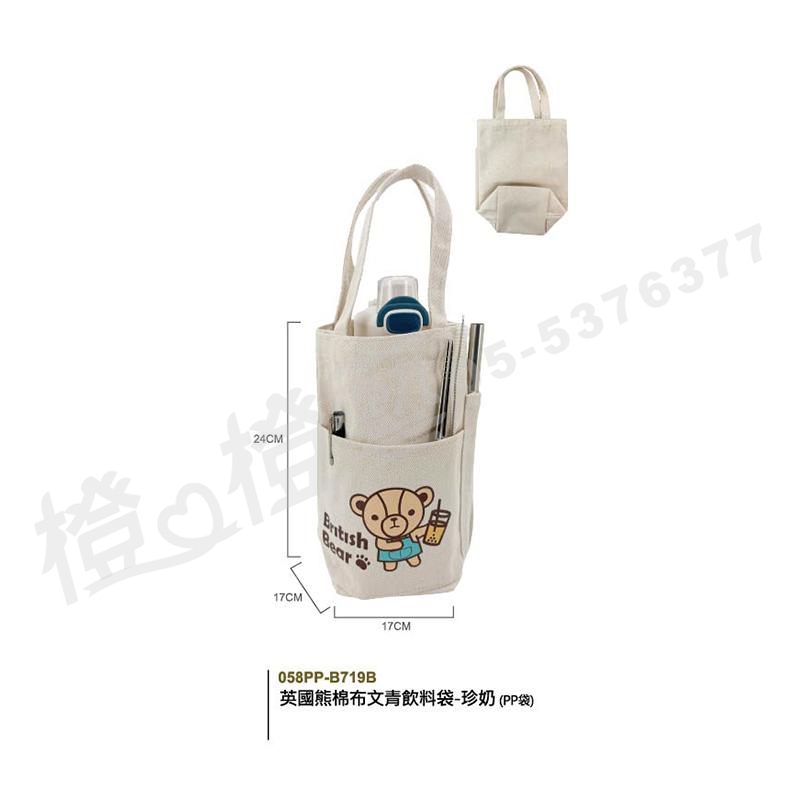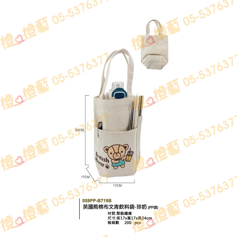 > 英國熊棉布文青飲料袋-珍奶(PP袋)/環保袋