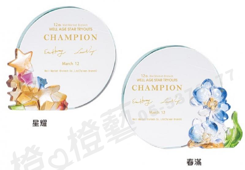 水晶琉璃-獎牌獎座獎盃藝品「退休、績優表揚、升官、榮陞」-鏤空彩色琉璃